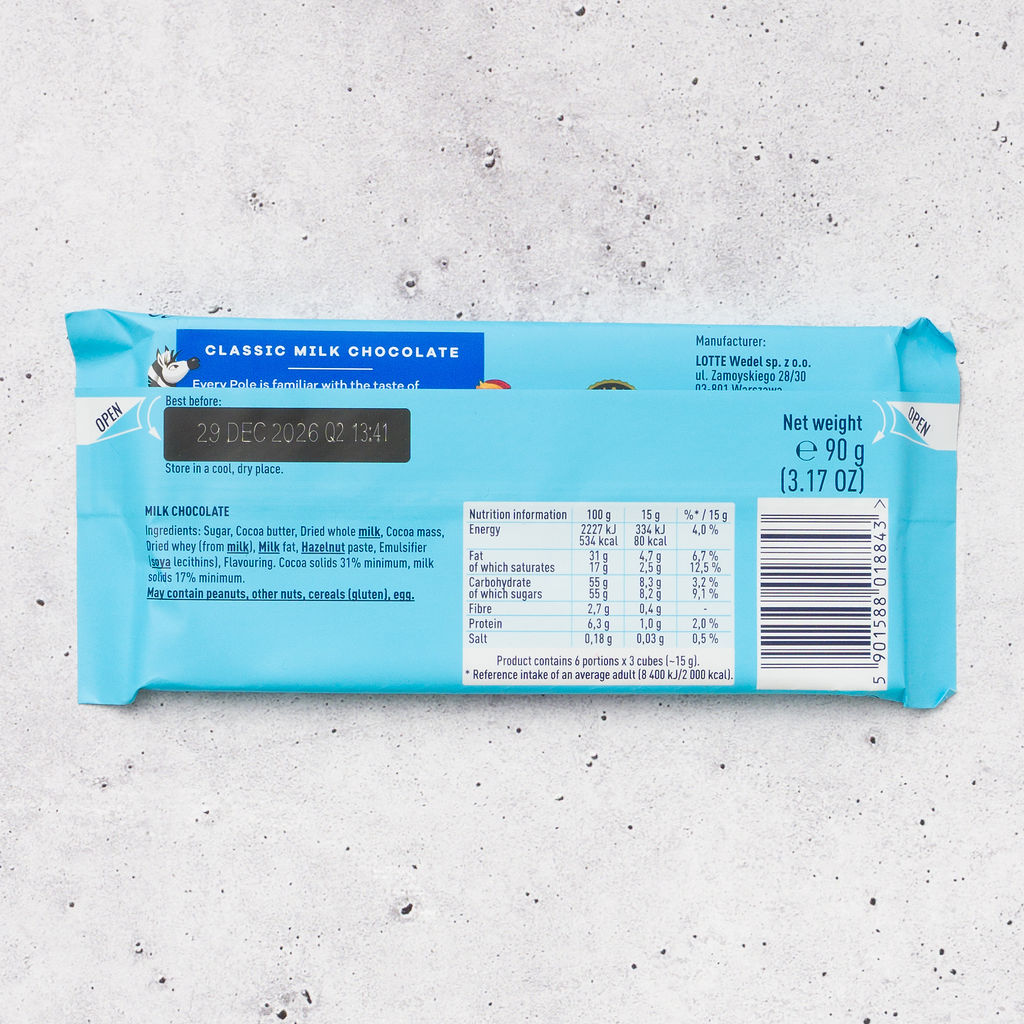 E. Wedel Milk Classic is a smooth and creamy milk chocolate bar crafted by Poland’s legendary chocolatier since 1851. Known for its balanced sweetness and velvety texture, this classic milk chocolate delivers rich cocoa flavor in every bite. A staple in Polish households, it’s perfect for enjoying on its own, sharing, or pairing with coffee or tea.