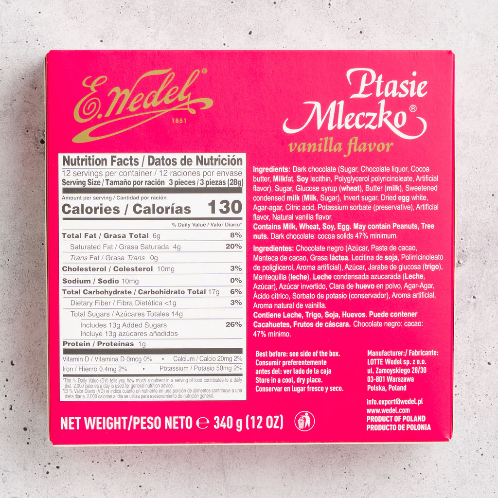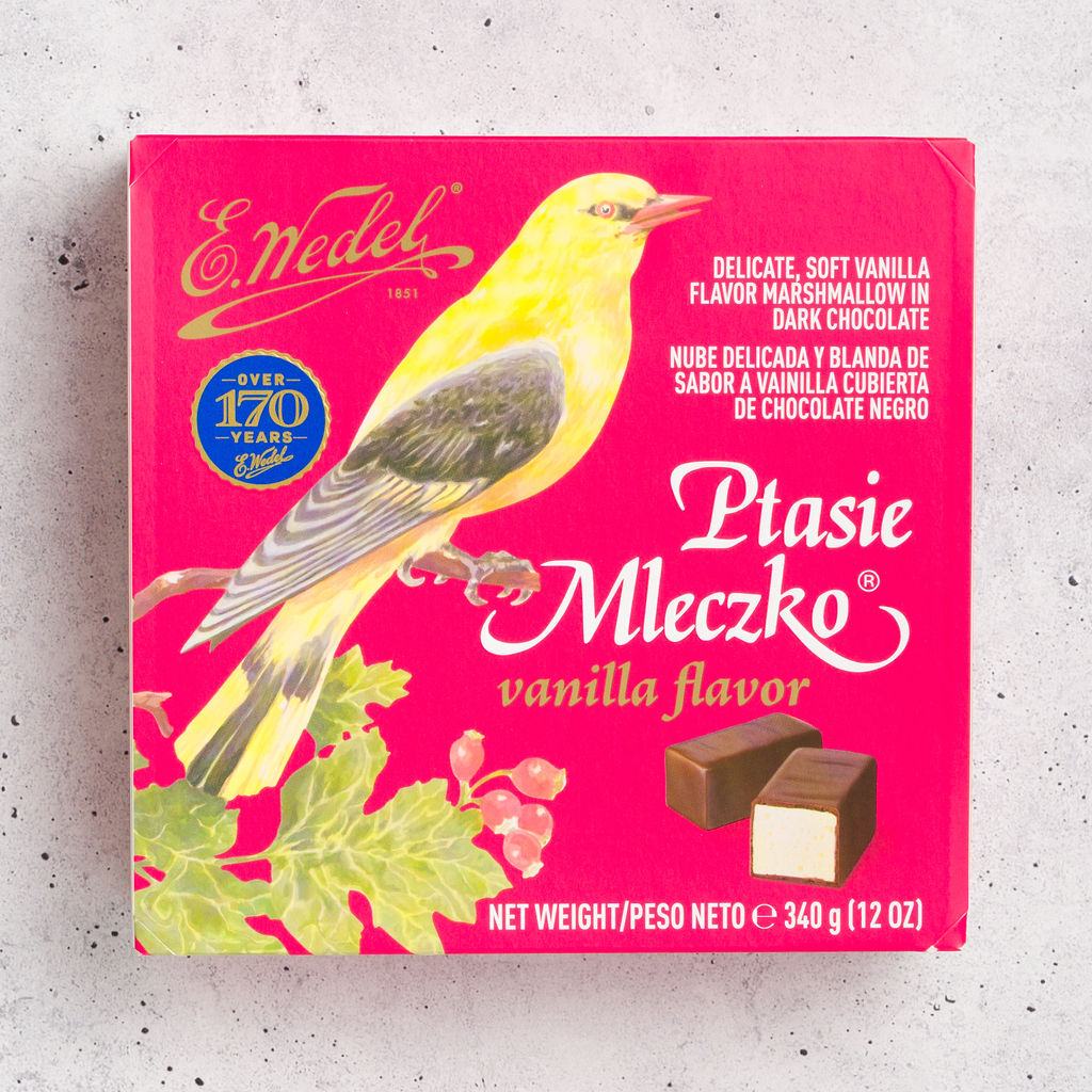 Ptasie Mleczko by E. Wedel is one of Poland’s most iconic confections. These delicate, soft vanilla marshmallow cubes are coated in rich dark chocolate, creating a light, airy texture balanced by smooth cocoa flavor. First introduced in 1936, Ptasie Mleczko remains a beloved Polish classic and a popular gift item for any occasion.