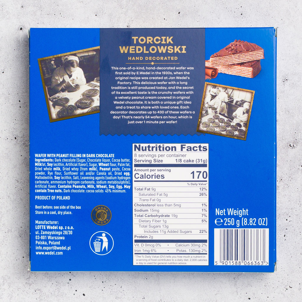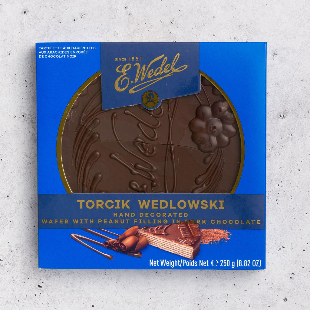 Torcik Wedlowski is one of Poland’s most iconic chocolate specialties, crafted by E. Wedel since 1851. This elegant round wafer cake features delicate layers of crisp wafers filled with smooth peanut cream, all coated in rich dark chocolate and hand-decorated on top. Beautifully packaged and perfect for gifting, it’s traditionally sliced and served with coffee or tea.