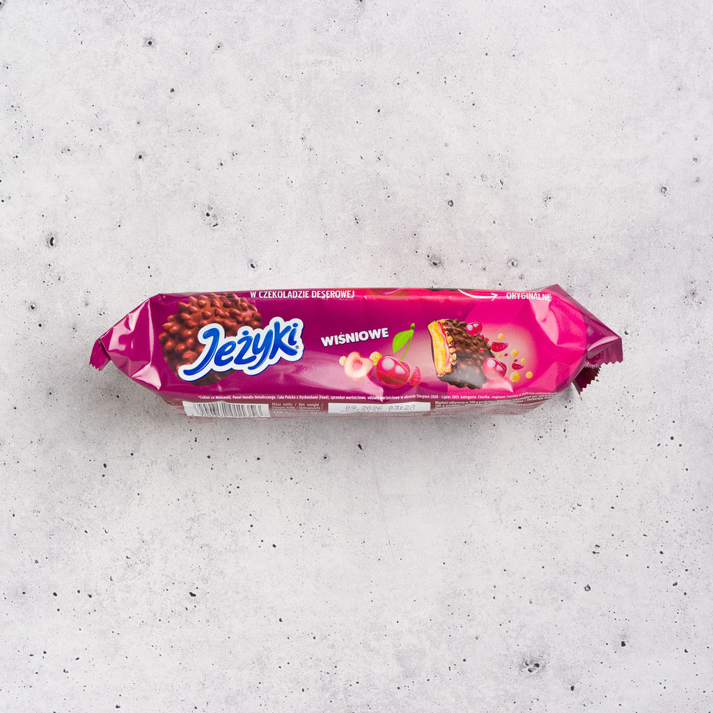 Jeżyki Cherry by Goplana is a fruity twist on the classic Polish favorite. Each bar features a soft biscuit base layered with sweet cherry filling and crunchy inclusions, all coated in rich chocolate. The combination of chocolate and cherry delivers a balanced sweet-tart flavor that makes this version especially popular with fruit lovers. A perfect treat with coffee or as a satisfying afternoon snack.