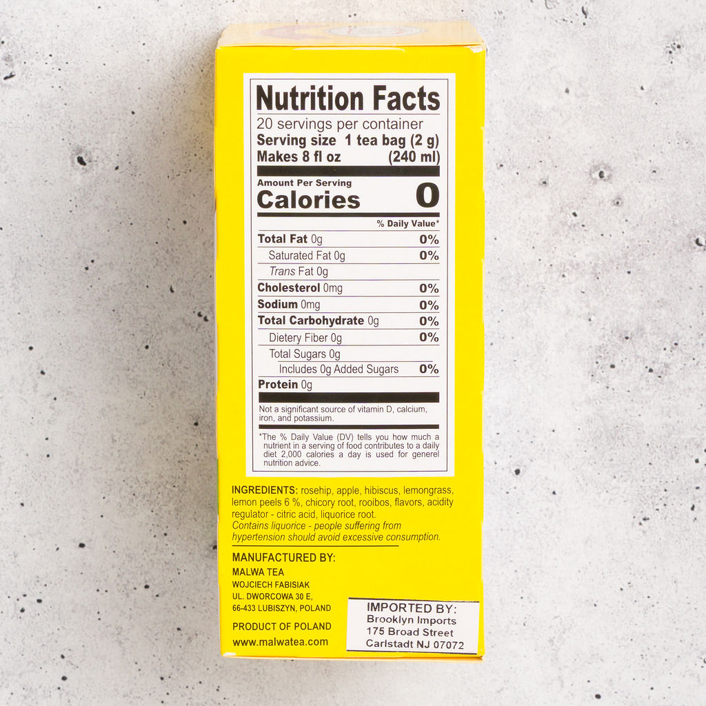 Malwa Cytryna is a refreshing lemon-flavored fruit and herbal tea blend made in Poland. This naturally caffeine-free infusion combines fruity and herbal notes with bright lemon flavor for a light, uplifting cup. Enjoy it hot for a soothing experience or iced for a crisp, citrus refreshment. A popular everyday tea choice in Polish homes.