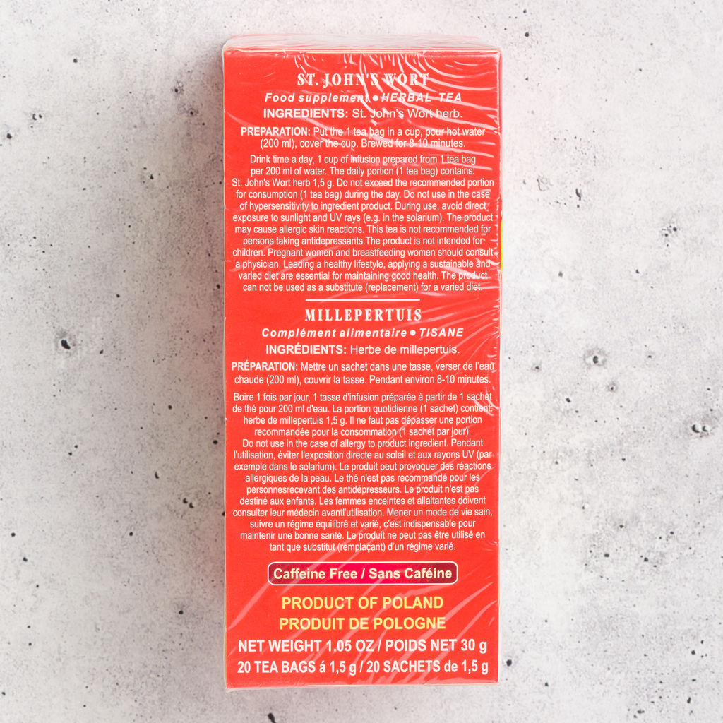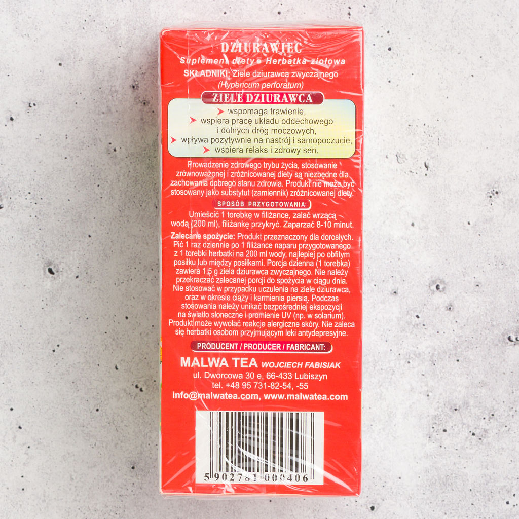 Malwa Dziurawiec is a traditional herbal tea made from 100% St. John’s Wort. Naturally caffeine-free, this classic European herbal infusion has a mild, slightly earthy flavor with gentle floral notes. A well-known herbal tea enjoyed throughout Poland.