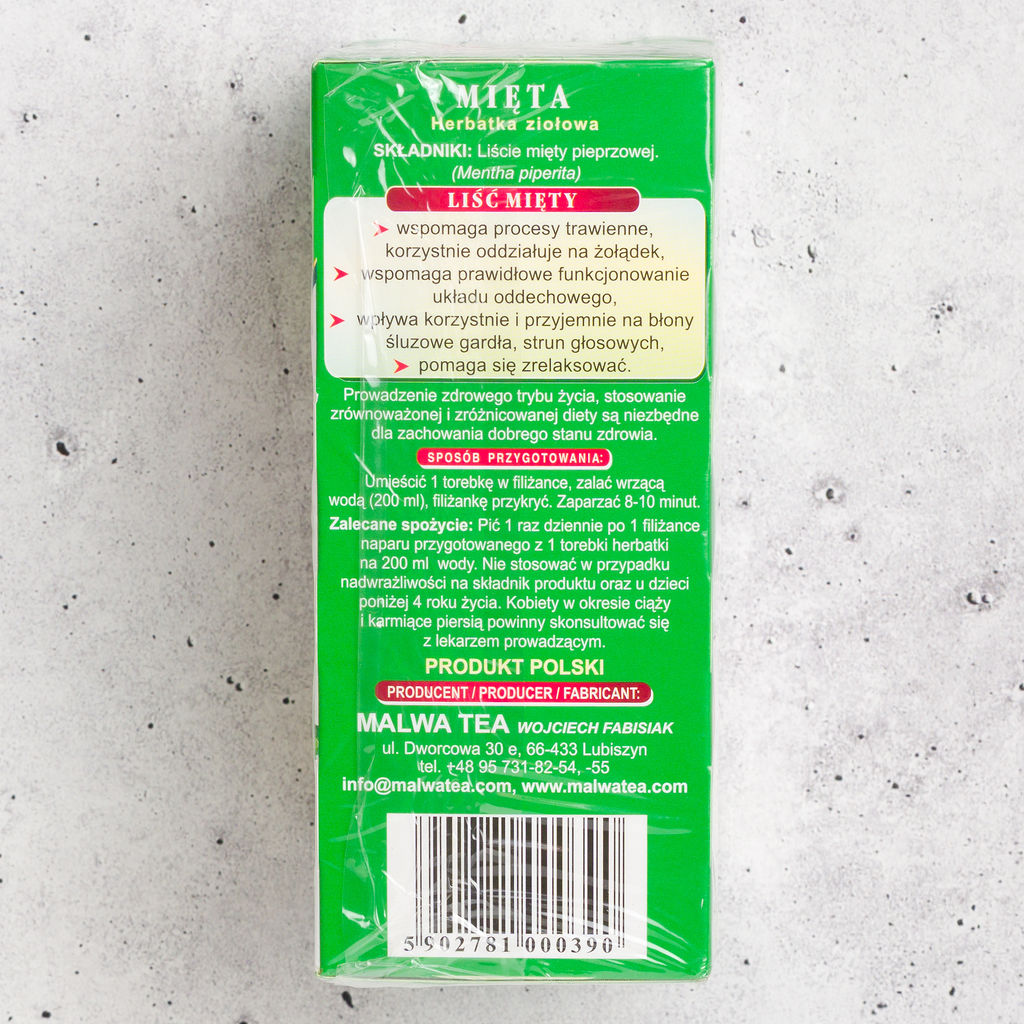 Malwa Mięta is a classic Polish herbal tea made from 100% mint leaves. Naturally caffeine-free, this refreshing infusion is known for its cool, clean taste and soothing properties. Perfect after meals or anytime you want a calming cup.