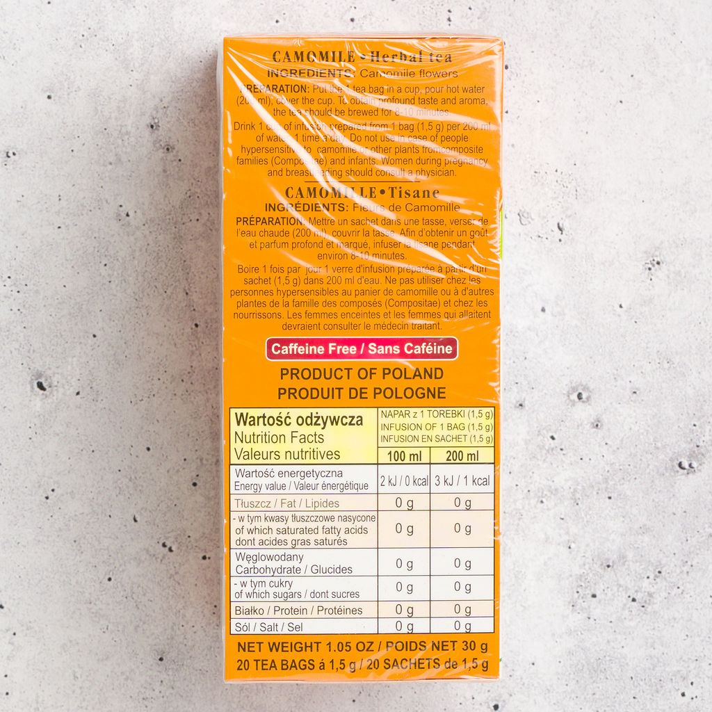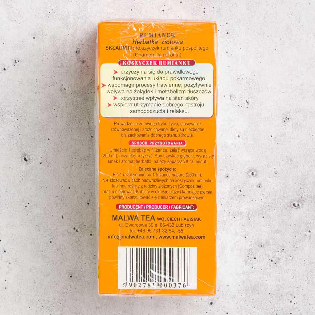 Malwa Rumianek is a traditional camomile herbal tea made from 100% chamomile flowers. Naturally caffeine-free, this gentle infusion is known for its mild, floral taste and comforting aroma. A classic evening tea enjoyed throughout Poland and Europe.