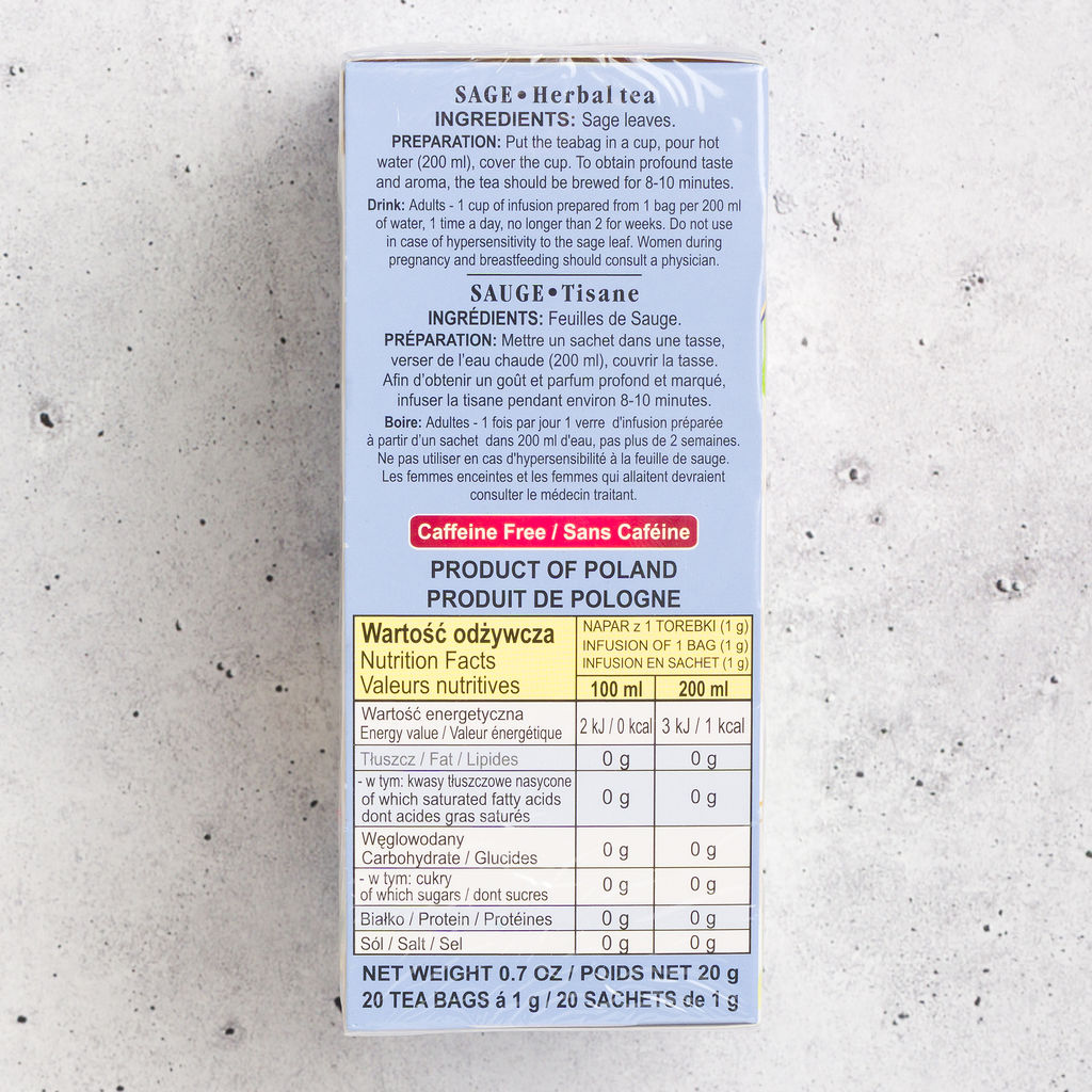 Malwa Szałwia is a classic herbal infusion made from 100% sage leaves. Sage tea has a distinctive, aromatic flavor and has long been enjoyed in European households as a traditional herbal beverage. Naturally caffeine-free.