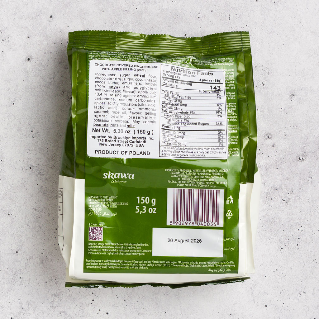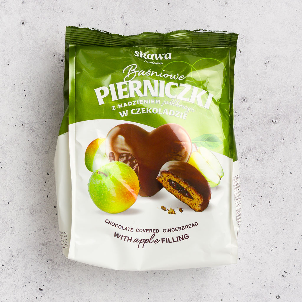 Skawa Baśniowe Pierniczki with Apple Filling are traditional Polish gingerbread cookies coated in smooth chocolate and filled with sweet apple jam. The soft, gently spiced gingerbread pairs perfectly with the fruity apple center, creating a comforting, classic flavor combination. Made in Wadowice by Skawa, these pierniczki are a popular everyday treat and especially enjoyed during the fall and holiday season.